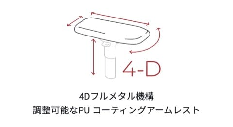 ▼4Dアームレスト(上下、前後、左右、角度の調整が可能)。自由自在な調整が可能でかなり使いやすいです。アームレストはPUレザー貼りでクッション性もあり。