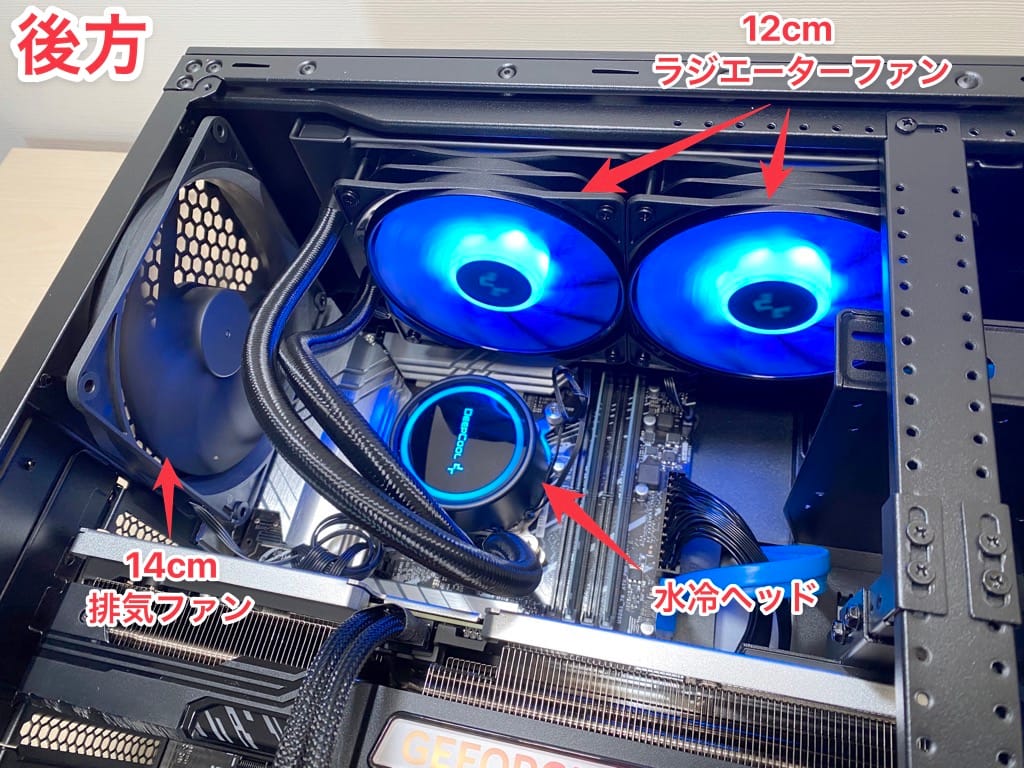 他メーカーだと後方排気ファンは一般的な12cmのことが多く、標準で大型ファンを搭載しているのは素晴らしいです。